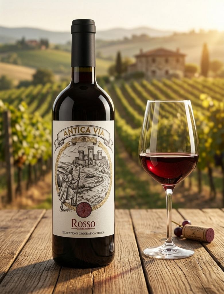 Gambassi Terme è stata per secoli una tappa fondamentale sul cammino di Sigerico verso Roma. L'”Antica Via” è la Francigena. Questo vino cerca di catturare quell’energia: è “vibrante come il cammino di un pellegrino“. Non un vino statico, ma un vino che si muove nel palato, fresco, dinamico, che invita al passo successivo, proprio come il viaggio di chi cammina verso una meta.